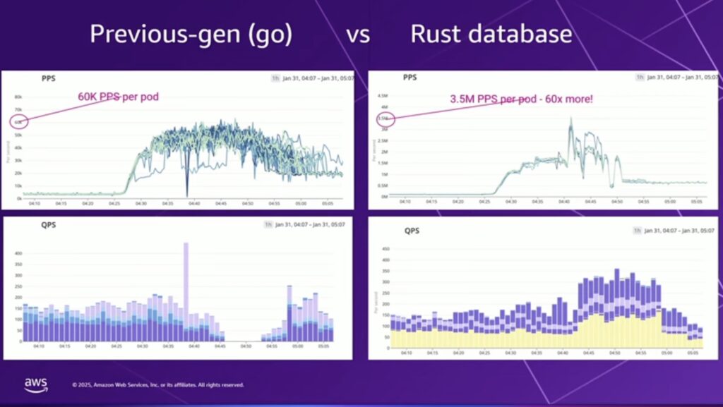 A J Stuyvenberg, a staff engineer at Datadog, and Darko Mesaros, principal developer advocate at AWS, presented a session on Rust at AWS. Mesaros kicked off with the story of Aurora DSQL, a distributed and mostly PostgreSQL compatible database, which was rewritten from Kotlin to Go to solve performance issues. That journey was described earlier this year by AWS CTO Werner Vogels. “The [Rust] code was 10x faster than our carefully tuned Kotlin implementation – despite no attempt to make it faster,” said Vogels.